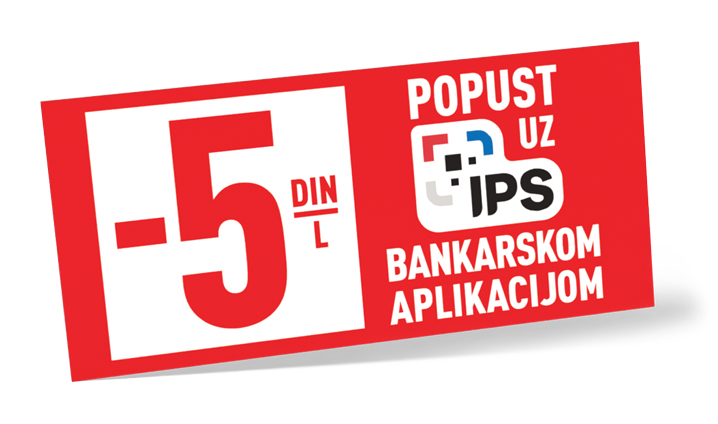 Kada plaćate pametno, brzo i lako, gorivo košta manje. Do 23. marta plaćajte gorivo bankarskom aplikacijom na vašem telefonu (IPS pokaži) ili Drive.Go aplikacijom (IPS način plaćanja) i dobijate popust od čak 5 dinara po litru na sva goriva.